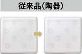 ※〈汚れ落ち比較〉素材表面に水アカを付着させ、水と浴室用合成洗剤(水アカ除去用中性タイプ)を含ませたスポンジに荷重1kgの力をかけて、表面をそれぞれ10往復させた結果を比べました。
